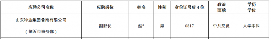 山東種業(yè)集團(tuán)魯南公司擬錄用人員公示